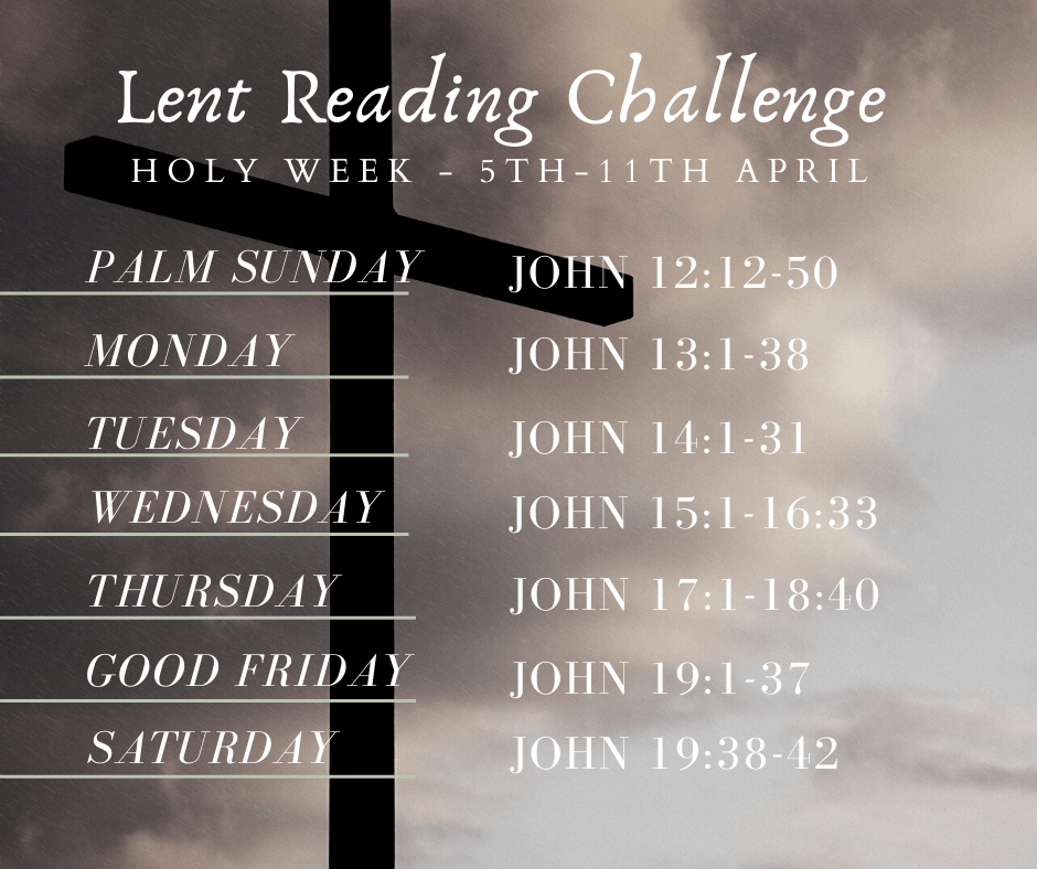Every day during Holy Week we will be posting a short devotion to guide you in your worship this week. Each one will consist of a reading, a reflection, and some prayers to help you respond.