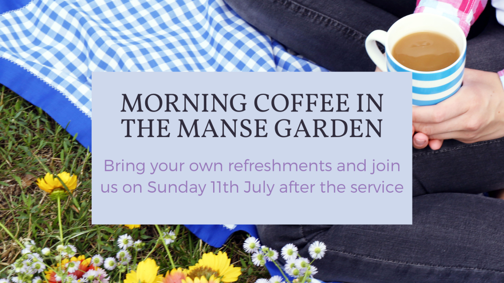 Next Sunday, the 11th of July, we are encouraging the congregation to stay after the service for coffee and a chat. Under the current restrictions you will need to bring you own refreshments, and we will gather outside in the manse garden (weather permitting!)