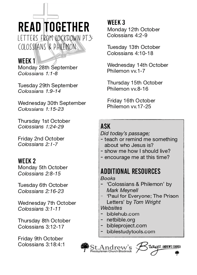 Welcome to our ‘Church at Home’ services for Sunday 4th October. On this page you will find prayers, readings, hymns and a short video message to help you to worship God this morning wherever you are. Today we are continuing our sermon series looking at the New Testament Letter to the Philippians.